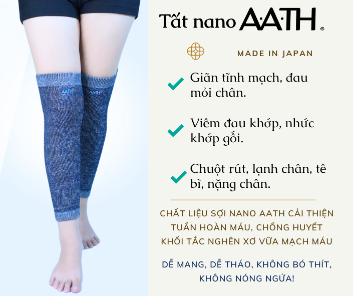 - Tất tĩnh mạchnano AATH Nhật Bản, cải thiện lưu thông máu, chống huyết khối. Giúp loại bỏ tê bì, chuột rút, đau mỏi, sưng nhức nặng chân, lạnh chân do lưu thông máu kém, giãn tĩnh mạch chân gây ra. Mang tất nano đi ngủ không cần kê chân cao và cho giấc ngủ ngon hơn. Nên bấm xem các câu hỏi thường gặp về Tất tĩnh mạch chân nano AATH bấm tại đây.